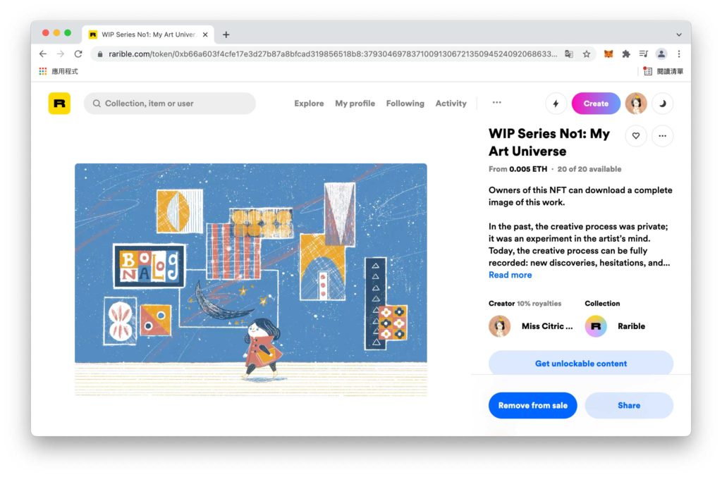Rarible是完全開源的NFT平台,任何有虛擬錢包的人都能加入。藝術家將作品上架到Rarible去展示不會收手續費,在NFT賣出後才會收2.5%的手續費。此外,在Rarible上架的作品也會出現在全球最大的NFT平台Opensea,因此Rarible賣家也可以獲得Opensea的龐大用戶基數。Opensea雖為世界最大的NFT交易平台,但上架時就要付出一筆初始手續費。因此我建議新手可以先找這種先成交後收費的平台,以0成本的方式來熟悉操作及試試市場水溫。